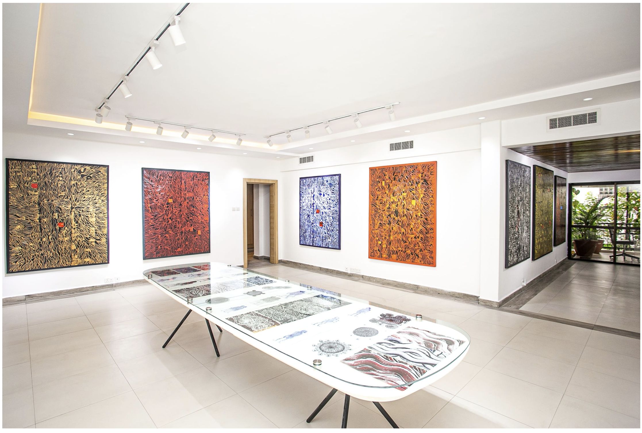 Drawing frequently on sheets of paper as well as sketchpads, Lawal has perfected his use of continuous lines to coax shape and movement in his exploration of psychic and physical states. In these works, standing figures with differing gestures suggest protest, resignation and idleness inspired by people from all walks of life. Other works examine the natural laws of balance and harmony, as well as the manipulations of mechanical systems like the wheel axis. Dense and webbed circular structures — often with smaller ones orbiting around them — take the form of graphical reflections on weight, mass and energy. Lawal’s lifelong obsession with the abstracted patterns on aso oke has engineered a recognisable visual signature — if “style’’ is too frivolous a word — but the meanings and interpretations differ from one work to another. The slim, flowing and densely packed lines in bold, opaque colours over jet-black underpaint could denote the mindless pursuit of wealth in one work. In a different work, a similar composition joyfully celebrates the ordinary and undistinguished.